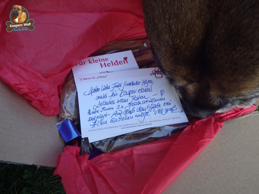 Eigentlich bin ich ja schon in Rente, aber heute durfte ich mal wieder als Produkttester aktiv sein. Mein Frauchen hat nämlich einen ganz netten Kontakt zur der Firma Carnello, und die machen super-tolle Leckerchen. Nicht nur toll, sondern auch gesund! Also hab' ich große Augen gemacht, als ein Paket für mich geliefert wurde und es mir gleich geschnappt. Es hat schon von außen so toll geduftet, dass ich direkt wusste, da muss eine besondere Leckerei drin sein!