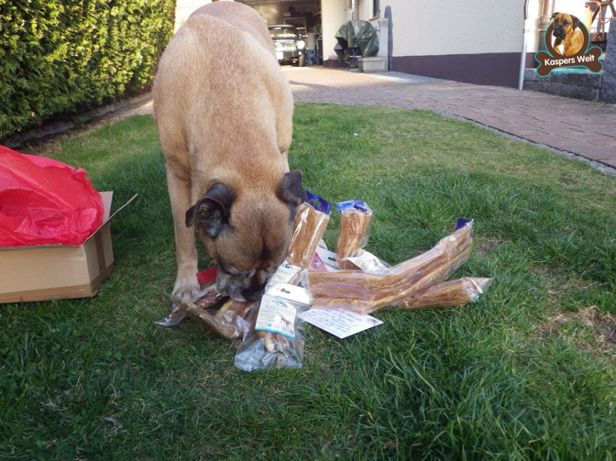 Und siehe da, ich habe recht behalten. Das Päckchen war prall gefüllt mit guten Sachen – und alles ganz allein für mich. Als Frauchen gesagt hat, das ich nicht alles auf einmal futtern darf, hab‘ ich natürlich erstmal ein langes Gesicht gezogen. Aber wenn ich es mir einteile, dann habe ich natürlich auch länger was davon! Eine Vorratshaltung kann sowieso nie schaden.