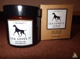 Dann hab‘ ich noch was entdeckt, was ich gerade tierisch gut brauchen kann. Nämlich eine Pfötchensalbe. Weil meine Pfote ja lang im Verband und im Schuh gesteckt hat, ist meine Haut unter den Ballen jetzt sehr empfindlich. Da kommt mir die Salbe gerade recht! Die ist natürlich auch ein toller Schutz bei Streusalz, Schnee und Eis, wovon ja bald wieder viel rumliegt. Ach und mein Frauchen hat sie auch an ihren Tatzen ausprobiert und gesagt, die Salbe pflegt ganz toll!