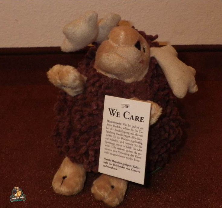 Wau, da haut’s einen gleich aus dem Schuh, wenn man denn einen tragen würde, wenn man das Päckchen aufmacht! Das ist ein "Du bist mein Lieblingsstück"-Package! Alles total liebevoll verpackt! Lustig fand ich gleich den Plüsch-Elch, denn Elche gibt’s hier bei uns ja nicht. Ich kenn‘ nur Rehe, aber so einen nordischen Kerl hab‘ ich noch nie gesehen. Jetzt hab‘ ich einen eigenen, ganz für mich allein, wie praktisch. Der quietscht sogar, wenn man drauf beißt, herrlich! Sowas mag ich bei Spielzeug ja besonders gern.