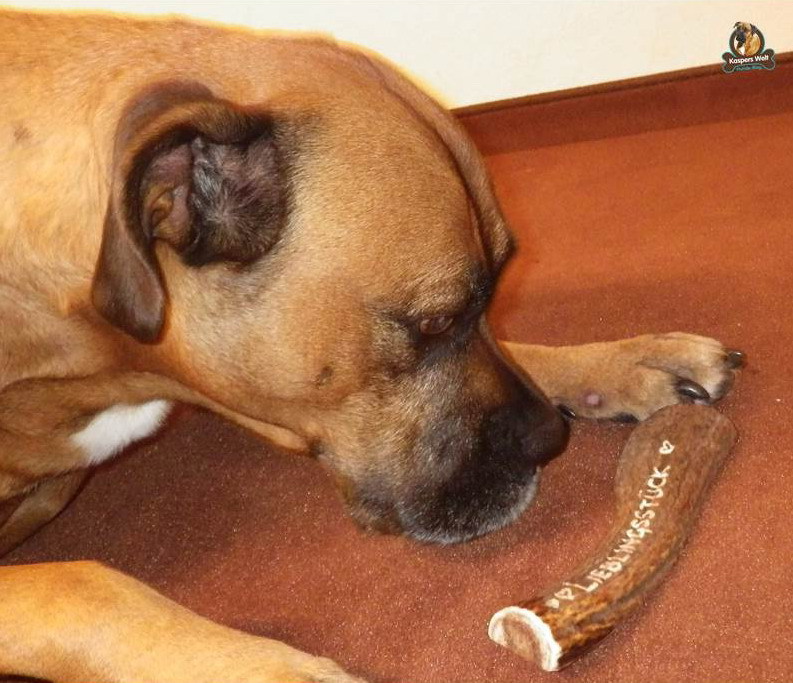 Am allerbesten gefällt mir aber der Kauknochen im Päckchen. Ich knabber‘ ja so gern, am liebsten abends beim Fernsehen. Manchmal schlafe ich dabei sogar ein, das Kauen strengt nämlich ganz schön an! Na jedenfalls ist dieses ein ganz besonderer Kauknochen, denn der kommt aus Österreich. Da war ich schon öfter im Urlaub, da gefällt’s mir. Irgendwie musste ich beim Schnuppern an dem Knochen gleich wieder an den Elch denken, denn der Knochen ist aus echtem Geweih, jawohl! Die Hirsche werfen dieses Geweih nämlich einmal pro Jahr ab. Warum das so ist, das weiß ich nicht, aber jemand hatte dadurch eine gute Idee und hat aus dem abgefallenen Geweih diese Kauknochen gemacht. „Lieblingsstück“ steht drauf – und genau das ist es jetzt auch für mich. Zumal dieser Knochen viel länger hält als die, die ich sonst immer bekomme. So kann ich was von meinem Taschengeld sparen, haha!