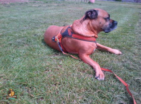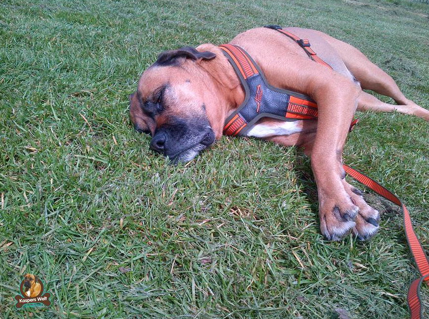Mein Geschirr, was ich vorher getragen habe, war ganz ok, aber es hat speziell im Sommer viel zu viel genau von der Region abgedeckt, an der man dann gute Belüftung braucht: nämlich über Herz und Lunge. Das Hundeführgeschirr „FOLLOW“ lässt aber genau diesen Regionen Luft. Außerdem ist der Gurt längs über meine Brust bis unter den Bauch sehr angenehm, da zwickt nix, das könnt ihr mir glauben! Schnell an- und ausgezogen ist es auch, da muss man nur an jeder Seite einen Klickverschluss drücken. Regen kann dem Geschirr auch nichts anhaben, denn das Material nimmt kein Wasser auf. Dadurch wird es auch nicht schwer, wenn es nass wird. Ich hingegen schon, aber ich kann mich ja ausschütteln, nicht wahr…